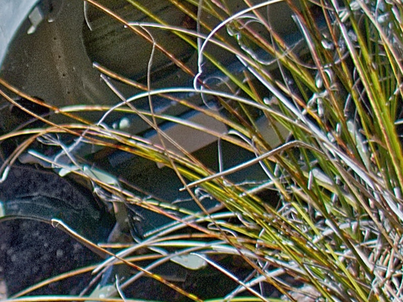 | This looks like the left-hand wing, mostly buried, and missing its leading edge. The fact that is removed from the center section fits with the assumption that the left front side made a heavy contact with (probably) a tree. |