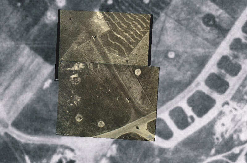 | Aerial view, clearly showing two of the three original runways overgrown with trees. The gliding airstrip can be seen north of the east-west runway (slighty right of the middle in the picture). On the south side (just left of the middle) a golf course can be seen. |