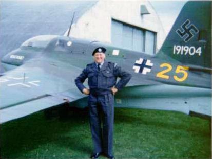 The Komet as on display at St. Athan, pictured in August 1975. The colors appear identical to those at Colerne, a pure middle green and a dark grey with a purplish cast. A white Werknummer has been added. The lettering 'ME163 KOMET' can be seen on the nose, but it appears to be some 20-30 percent larger than seen at Colerne. Of note is the small pin projecting from the upper wing surface, just ahead and inboard of the Iron Cross. This is a 'flaps down' indicator.