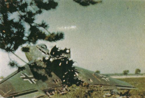 Airfoil caption: This Me 163B 'Komet' was discovered destroyed at Polenz, a dispersal area for Brandis airfield. The wings are finished in the late war scheme of Braunviolett (Brown-Violet) 81 and Dunkelgrun (Dark-Green) 82. Note that the Brown-Violet 81 assumes the brownish-violet cast that its name implies, just as the 82 is in fact dark green! The wing camouflage has been allies in a soft-edged splinter. The upper wing Balkenkreuze are the older black and white style, a not uncommon occurrence on these craft. The undersurface color is most likely Lichtblau (Light Blue) 76 under some of the exposed panel edges, traces of red-oxide primer can be seen.