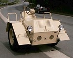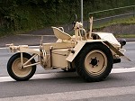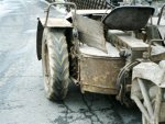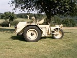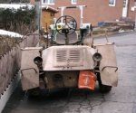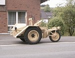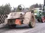 Martin finished the restoration late May, after some five months of work. Some parts were worn, but that is not surprising for a 60 year old vehicle. The rear wheel is now detachable, as it used to be when it was designed. The engine and gearbox were sandblasted. The color should be RAL 7028 Dunkelgelb II, but there are no surviving samples of this color. Martin considers adding the second steering wheel, to be built from original drawings. The first two photos below show much of the internals of the Scheuch-Schlepper. A box-shaped gearbox is located near each wheel; it contains a chain-driven reduction gear of about 3:1. Two versions of this reduction gear were used, one giving a top speed of 16 km/h, the other 32 km/h. Martin's Schlepper reaches the latter speed, although he comments that "considering the driving characteristics the top speed is frightfully high". Martin also noted that the rear wheels jumps easily, and under heavy braking it tends to ride on the front wheels. The remainder of the photos show the completed Schlepper with only minor parts still to be added, such as the engine starter crank, which is placed in the tube on the left front fender, and then doubles as a support for the passenger. All in all an excellent job! Martin plans to drive the Schlepper with its designer Rudolf Scheuch.