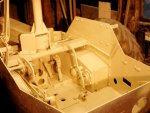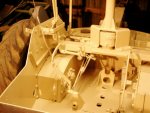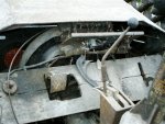 The restoration also resulted in a much better understanding of the Schlepper's operation. For example, the steering wheel has three settings, controlled by a small lever on top of the steering housing. The three setting are coarse, fine (a reduction gear is switched in) and off. For the latter situation the Schlepper can be steered via differential braking on the front wheels, using a big lever as seen in this photo. When the lever is moved forward, the left wheel is braked, and the Schlepper turns left, and vice-versa. The exact use of the second steering method is not clear yet.