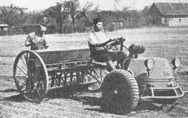 The photo caption reads 'Auto-Union / Scheuch-Einachs-Schlepper mit Drillmaschine' or 'Auto-Union / Scheuch single-axis tractor with vibrating (?) equipment'.