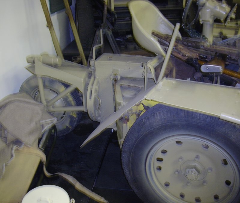Detail view of the rear section, showing the pivoting system of the rear wheel. The pivot is located underneath the seat. A heavy L-shaped beam leads to the rear wheel fork. The rear wheel can be removed just behind the circular plates. The seat is mounted on a circular cross-beam to allow rear wheel movement. Fuel filler cap is located to the right of the seat.