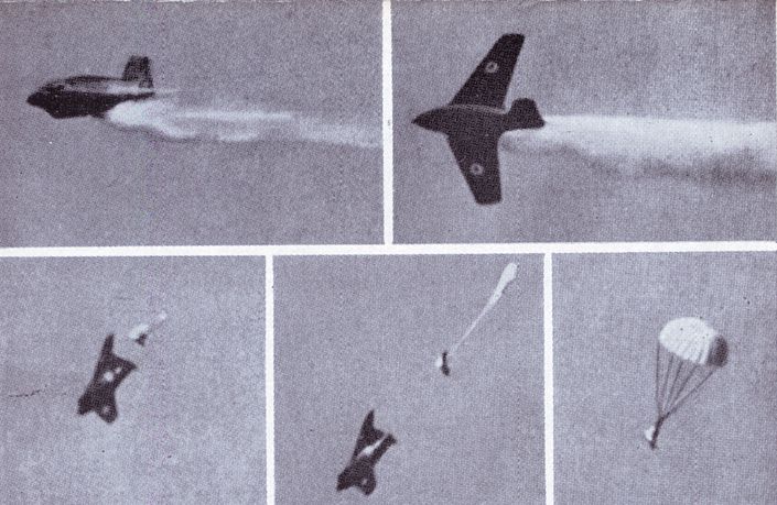The photo below was published in "Le Messerschmitt Diabolique ", the French translation of Mano Ziegler's "Raketenjäger Me163 - Tatsachenbericht von einem der überlebte", and was kindly provided by Gilbert Haentjens from Belgium. It shows the dramatic last seconds of a Komet. The first photo seems to capture the moment of opening the emergency T-Stoff dumping valve. In the second photo the dumping is going full blast. In the third photo the T-Stoff dumping seems to have finished, and the pilot has just bailed out. The last two photos show the parachute deploying.