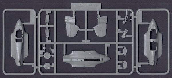 The third sprue contains the clear parts. Notable is the middle part on the right; this a clear fuselage parts that includes the rear-view windows. The Trimaster kit also uses this solution.