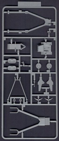 The fourth and last sprue contains all the parts for the Scheuch-Schlepper. This appears to be partly inspired by the Heller 1/72 Scheuch-Schlepper. The faceted engine compartment is represented more accurately than on the Heller model, but the lower side of the front angles back far too much. The main wheels appear to be some 10-20% too small. The rear end of the tractor is incorrectly modeled, but that is not surprising considering that this area is not visible in wartime photos. Only from the photos of two surviving Scheuch-Schleppers, that surfaced in 2003 and 2005, we now know how that part of the Schlepper looked.