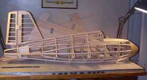 | The frame and stringer fuselage is then covered with strips of thin balsa (1/16" soft balsa), attached with cyano-acrylate glue. Being composed of many narrow strips, it is a bit rough though. The vertical tail is treated similarly. Shown in this picture however is the removable servo/receiver hatch. | ||