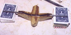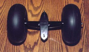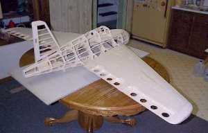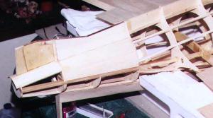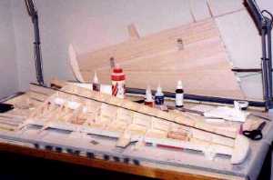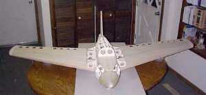 | The wings are built up as follows. The spars are 3" high x 1/4" thick x 42" long (approximately) light balsa, reinforced with .03" thick x 1/4" wide unidirectional carbon fiber strips laminated on the top and bottom of the spar. The ribs are 3/32" thick light balsa, 11 per side, spaced approximately 3 1/2". Light balsa wood blocks are used on the wing tips, and have to be added to the tail root and the leading edge of the wing roots. The leading edge is 3/8" thick soft balsa (tapered), and the trailing edge is 1/4" thick soft balsa. 1/16" thick soft balsa sheeting covers the wing. | ||