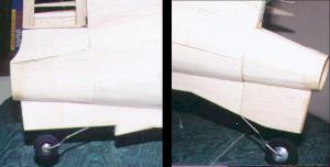 | Bob learned that an R/C Komet needs a different ground attitude than a real one, in order to get enough lift for take-off. To achieve the required nose-up attitude, the original tail wheel housing seen right was modified to the shape seen on the left. | ||