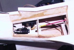| This picture shows the servos are installed beneath the removable hatch. Bob used a pair of standard Futaba S148 servos here. One controls the throttle and the other controls the rudder/tail wheel assembly. | ||