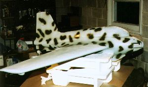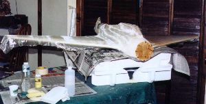 | After completion of the sanding, the whole model is covered with fiberglass (1/2 ounce per square yard) and epoxy resin. The lower right wing has been glassed and it waiting to be trimmed and lightly sanded. The lower left side of the model is covered with one continuous dry piece of glass fiber cloth. The fabric hanging down on the lower right wing's leading edge shows how transparent glass fiber becomes when impregnated with epoxy. After covering the whole model in glass fiber, it is given one last light sanding. | ||