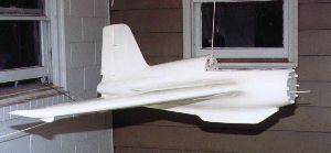 | Front view, showing of the very realistic planform. The airframe as currently pictured weighs approximately 5 pounds. The total weight is expected to be around 13 pounds flight ready with an empty tank. | ||