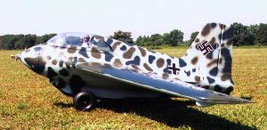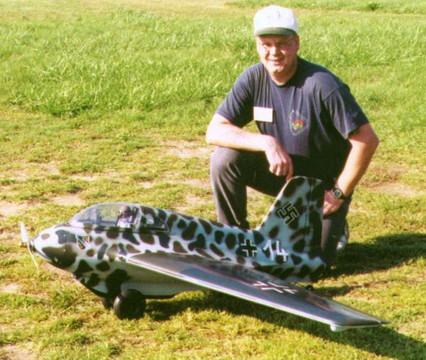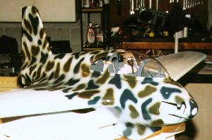 Bob Chubb from Stowe, Pennsylvania sent me this report on his 82 inch wing span (1/4.5 scale) Me 163 model. It is based on drawings by Jim Kiehl (Largo, Florida, (727) 595-0954), who sells them for $50. Joe Saitta (Seminal, Florida, (727) 398-4417) sells packages of pre-cut kits containing light plywood formers, spars, balsa ribs, and the cockpit components based on these drawings. Together with the clear canopy, the fiberglass cowl (nose cone) and most of the other flat balsa stock, the kit sells for $180. A deluxe version became recently available: it includes a fiberglass fuselage, and costs $290. According to Bob it will cut building time a lot, and reduce the weight considerably. For scratch builders the fiberglass cowl (nose cone) and the vacuum formed canopy are available for $55.00. Lastly, plans and a kit for a 100" wing span version with removable wings are also available.