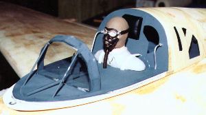 | The cockpit and canopy under construction. The fuel tank will be housed right under the cockpit, so the detailing stops at the pilot's shoulder level. Note the window frame with bulletproof glass just in front of the pilot. The pilot has been also given an oxygen mask. | ||