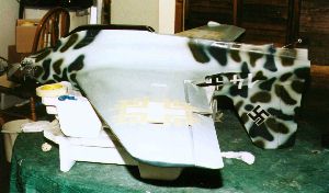 | Markings were applied with custom-made masks. Note the code '14' and the swastika already applied to the fuselage and tail, and the iron cross mask applied to the lower wing surface. | ||