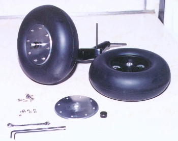 | The finished dolly with wheels fitted. The limited selection of RC tires resulted in too wide tires being fitted, but they will likely provide better springing during take-off and its own crash landing after being ejected! The wheel covers are custom made by a friend of Bob's, with 8 lug nuts. | ||