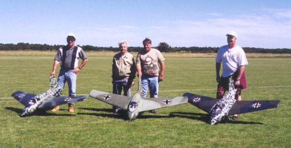 Concluding this report, a great photo of three RC Komets and their builders (left to right: Kevin Shaw, Sal Calvegna and Bob Chubb), joined by Komet pilot Rudolf Opitz. What more could a modeler want?