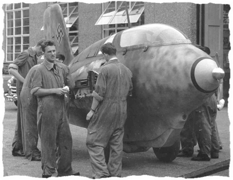 Great front view, showing the very regular and soft mottling of the front fuselage, and a more solid camouflage on the center fuselage. Other details are the canopy hinges, the electrical receptacle just below and ahead of the front hinge, and the shiny generator prop.