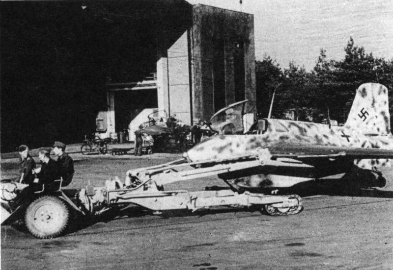 'White 14' being returned to the hangar on the hydraulic Scheuch-Schlepper after the flight. The camouflage scheme can be seen in great detail in this picture. Also note again the pitot tube attachment reinforcement. In the background a Komet can be seen with its rear fuselage detached.