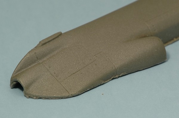 | This photo shows the typical detailing of the model. The resin has a metallic look to it. As usual with resin models, considerable attention needs to be spent on the mating surfaces. The shape of the rear lower fuselage is not correct. The model's width is continuous up the the rear of the horizontals. Photos of pylon-mounted AGM-86s show that there's a discrete step in the width just ahead of the horizontals. The 1/72 model by Projekts Model Company has this shape correct. I also think that the mounting points for the horizontals are set too low. It will be an interesting challenge to modify to model to the correct shape. |