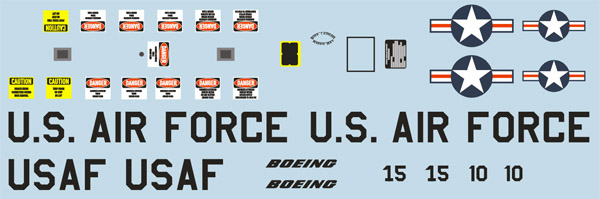 The model does not contain decals. I designed a sheet for the flight test version, that had more markings compared to the operational version. Two funny things in the markings were the non-standard star & bars and the non-standard 'C' in FORCE with rounded corners. I copied the mistakes in the decals. The operational version used a much reduced set of markings, consisting of just the warnings.