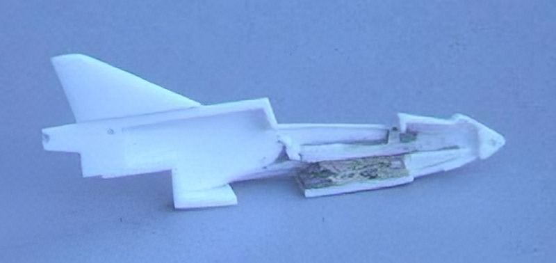 | In this photo, fuselage and wing have been glued together with CA (super) glue. After the assembly of the fuselage, I added the wing with great care. I first attached it using tiny drops of CA glue, then thoroughly checked the alignment (both dihedral and plan view). This proved to be perfect, and more CA was used to create a definitive assembly. The fit of the wing is not perfect: some Milliput will be needed to make things flush. The boxed-in main gear wells and the newly-created nose gear well can be seen clearly here. The rear fuselage/elevator part is not added yet. |