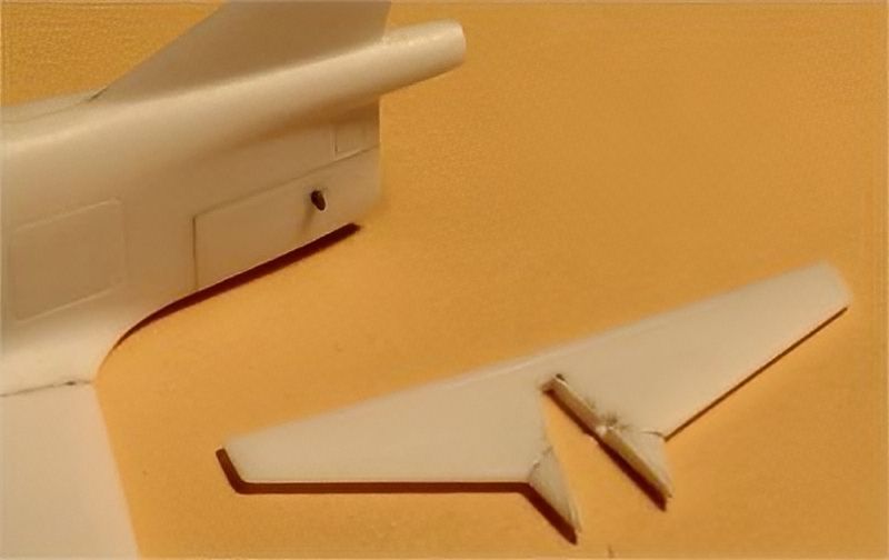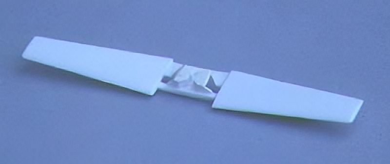 | The wing. The main landing gear openings (depressions actually) were cut open, and boxes were built from small pieces of card. The cross-section drawing showed a 3 mm height of these boxes, but I limited it to 2 mm. Since the wing was 0.5 mm, I added 1.5 mm. The boxes are partially closed by more card; on the inside they are closed by the fuselage parts (as can be seen in the next picture).