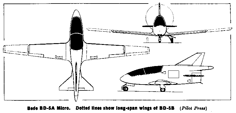 A three-view drawing of the BD-5A and BD-5B was published in the 1973/74 issue. Length minus pitot tube is 3.78 meters. The wing planforms are probably not correct. The A and B wings have the same ribsm but with a different pitch. The tip chord of the A and B wings is identical, and the drawing does not show this correctly.