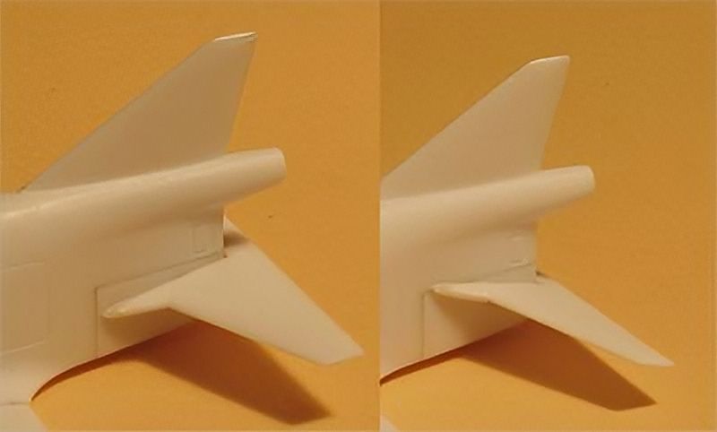 | After a long break from working on the model, I started it again in 2002. First job was to add the lower rear fuselage/elevator. I decided to make my model a little more interesting by cutting off the elevator, and make it posable. I used a razor saw to remove the elevator, being extra careful not to break at the rear side, where it is very narrow. I sanded the part smooth and glued it to the fuselage. The gaps were filled with CA. During the sanding of the gaps I realised how much easier things are without the elevator in the way. Then it was time to install the elevator again. Although thin, the razor saw had removed some material, and I restored it using my thinnest plastic card (just visible in the photo). Some more fiddling and my elevator was a snug fit again. From a cutaway drawing I decided where to put the elevator's pivot; I drilled a hole and glued a short piece of 0.5 mm steel wire in the hole. I cut tiny notches in the lower side of the elevator, and now it snaps in place and is posable. It looks very nice indeed. |