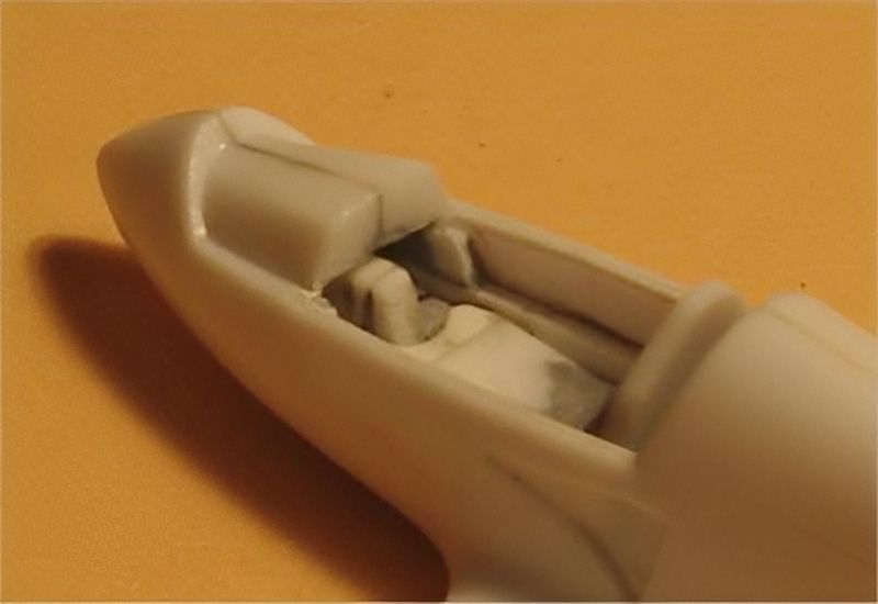| I started by thinning the cockpit walls, and then added a top longeron. Next I made side console from plastic card, the width about one millimeter. Then I extended the rear cockpit bulkhead down to the seat level, to prevent see-through effects. A nose landing gear well or opening was completely absent, so I cut out the opening and created a box with card. The top of the box also serves as the front cockpit floor. The model is a definite tail sitter, so I filled every possible space in front of the main landing gear with pieces of lead, and filled left-over spaces with Milliput. The assembled model now balances around the leading edge of the wing, well forward of the main landing gear. |