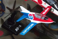 It had been reported for some time that ARII owned the LS molds, and in summer 2003 they finally reissued the kit. The box is now twice as big, and inside you will find no fewer than four BD-5's! You get two jet-powered 5J's and two prop-powered 5B's. Contrary to some reports, you get all parts for four aircraft (including four landing gears). The box contains two stands only however, but that shouldn't be a problem. The decals are identical to those of LS, but the printing is sharper, which is most noticable in the small lettering of the Acrostars aircraft. A drawback of the sharper decals is that some spelling errors are revealed :-) On the negative side, the canopies are not as clear as the original issue, and one has a pimple on the inside. Kit number is 32107, and in Japan it costs 1000 Yen. See Hobby Link Japan for more details.