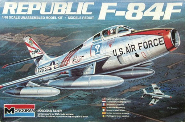 | The Monogram F-84F model dates from 1984. The first issue, #5432 with Vietnam camo USAF model as box art, was molded in olive drab. My kit was the second issue, #5437 with a bare metal Streak in flight, was molded in light gray plastic. That second issue came with just three fuel tanks, not ideal if you don't want to portray a nuclear mission. Two more issues followed by Monogram (74018) and Revell-Germany (04526). |