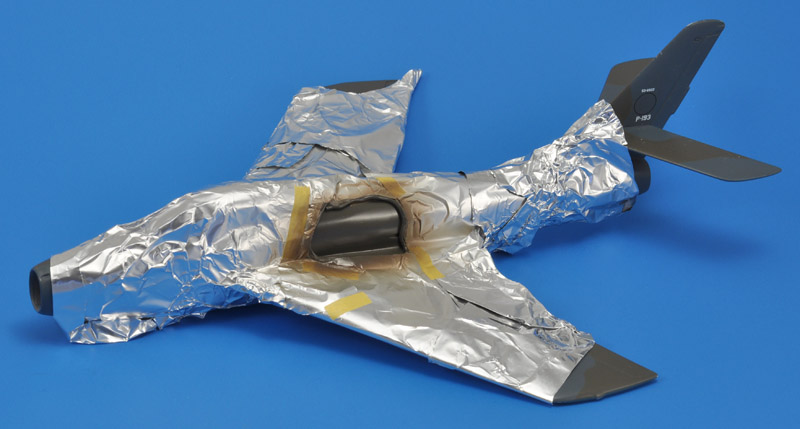 | I wanted to make a model with a solid feel, and a good sturdiness. Therefore I decided to fill the model with resin, something I had done a long time ago with a Monogram 1/48 P-47. To avoid a very heavy model, plus the risk of exothermic reactions that could melt the model, I filled it partially with some old Rohacell foam. At the back I installed a piece of K&S 15/32" (11.9 mm) brass tube with its forward end plugged, to serve as an exhaust and a solid mounting point for a stick (if so required). |