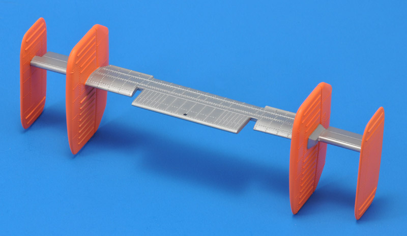| I assembled the nine parts that make up the massive tail unit. It's a delicate structure - the real thing has lots of bracing that the kit lacks, and I did not want to add. Predictably, I broke off the vertical tail surfaces on one side. It was repaired with 0.75 mm steel wires embedded in the parts. The parts had lots of ejector pin marks that I filled with Mr Surfacer from a bottle.