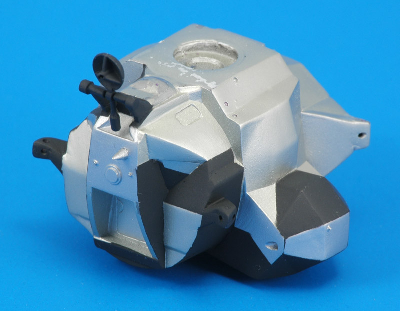 To create the cone shapes on the upper struts, I glued on 3 mm plastic card discs with a center hole, and used Apoxie to build up the cone shape. The whole assembly was painted with Revell 9 coal black. |