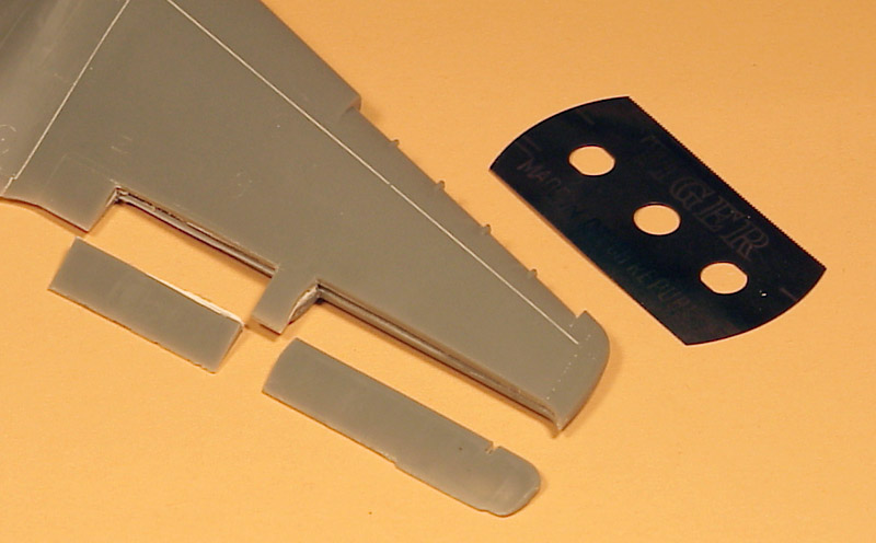 I wanted to try displaced control surfaces on this model. The elevons were easy to removed, since there is a gap between them and the wing. Only the inboard edge required sawing with a JLC razor saw. The trim flaps had to be cut out all the way with the JLC razor saw. Since I wanted to depict an early Komet with short-span trim flaps, I made the inboard cut some 8 mm further outboard. The remaining panel lines and fabric effect were filled.