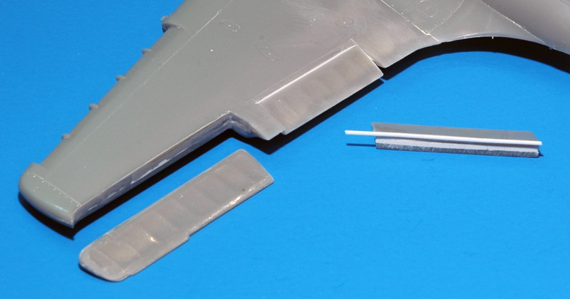 | The fuselage side of the joint was modified with a similar 0.5 mm plastic strip (tapering to zero top and bottom) and Apoxie, followed by sanding.