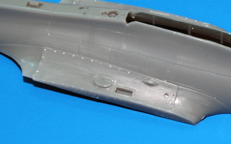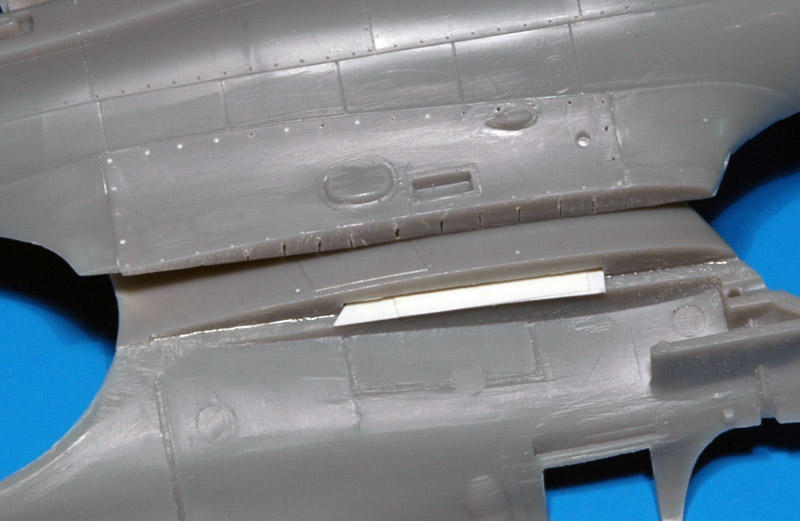 | Trimaster added a strange raised strip around most of the lower gun bay panel. The real thing doesn't have it, so it had to go. To avoid losing the fastener detail, I first drilled out all fasteners with an 0.3 mm drill. The raised strip was then removed by scraping with a small scalpel, followed by a light sanding. The panel is still slightly raised, as museum photos show.