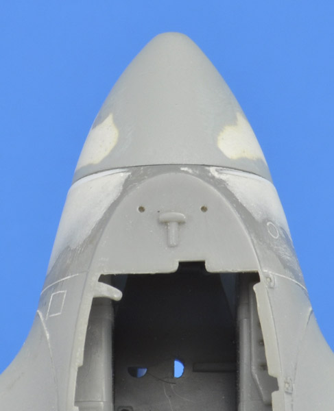 I started by gluing 0.5 mm plastic strip to rear edge of the nose cone. That 0.5 mm thickening was enough to allow a continuous curve of the sides of the nose. Next I sanding the strips to a fine taper near the top and bottom, so the nose would have the original diameter there. I applied Apoxie to build up the nose cone. I then switched to Tamiya putty and then paint to fine-tune the shape modification.