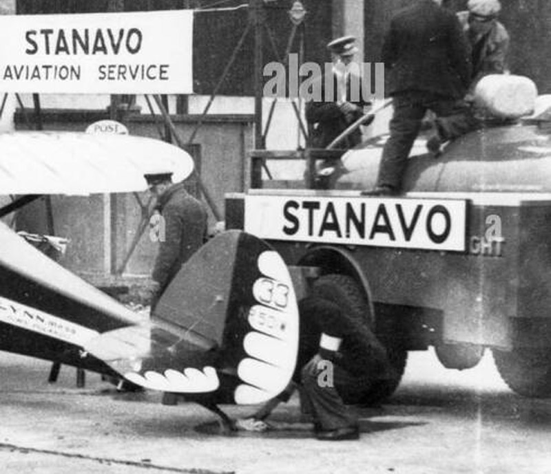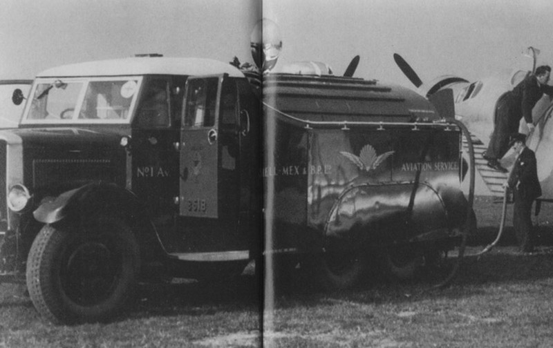 | Probably the same truck, it's refueling the same aircraft. 'Stanavo' sign mounted over original markings; only 'GHT' can be seen. Single rear axle. |