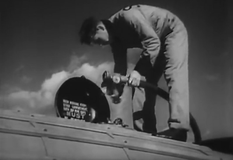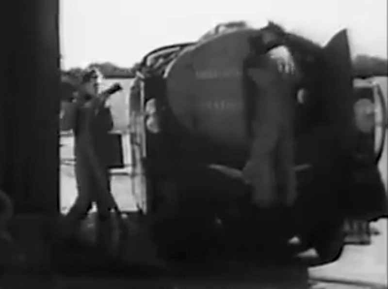 | I reasoned that some of the fuel trucks were borrowed from other airports, or that other airports used similar trucks. That turned out to be true for this particular fuel truck. All of the following pictures are screenshots from Airport - first-ever film made film by the Shell Film Unit describing a day in the Croydon Airport.