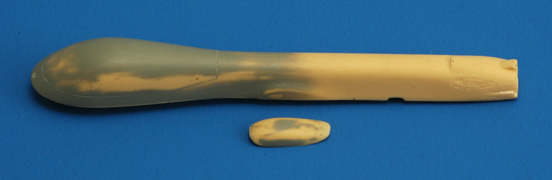 | This is the fuselage after a lot of sanding and priming, plus filling air bubbles with CA, and it's starting to look like a decent part. But many resin kits do not require this kind of preparations. Not visible in this photo is that the landing gear wheel wells are not deep enough and not symmetrical.