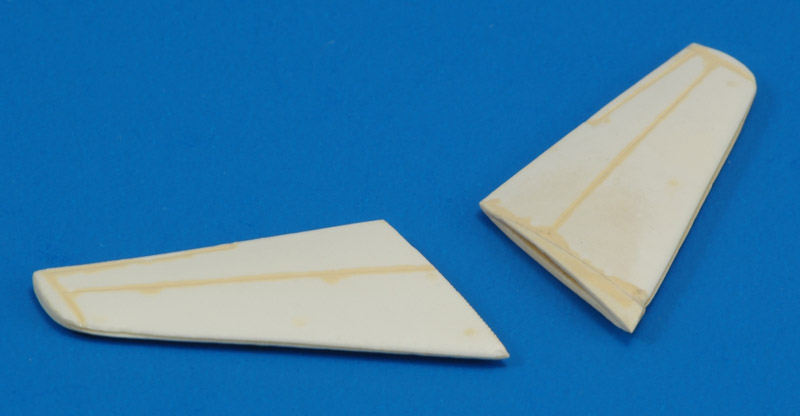 | The wings were maybe not too bad, but I concluded the sweep angle was wrong. On the left-hand wing (right in the photo) you can see a small wedge added at the root. Plus more Faller glue in the panel lines. |